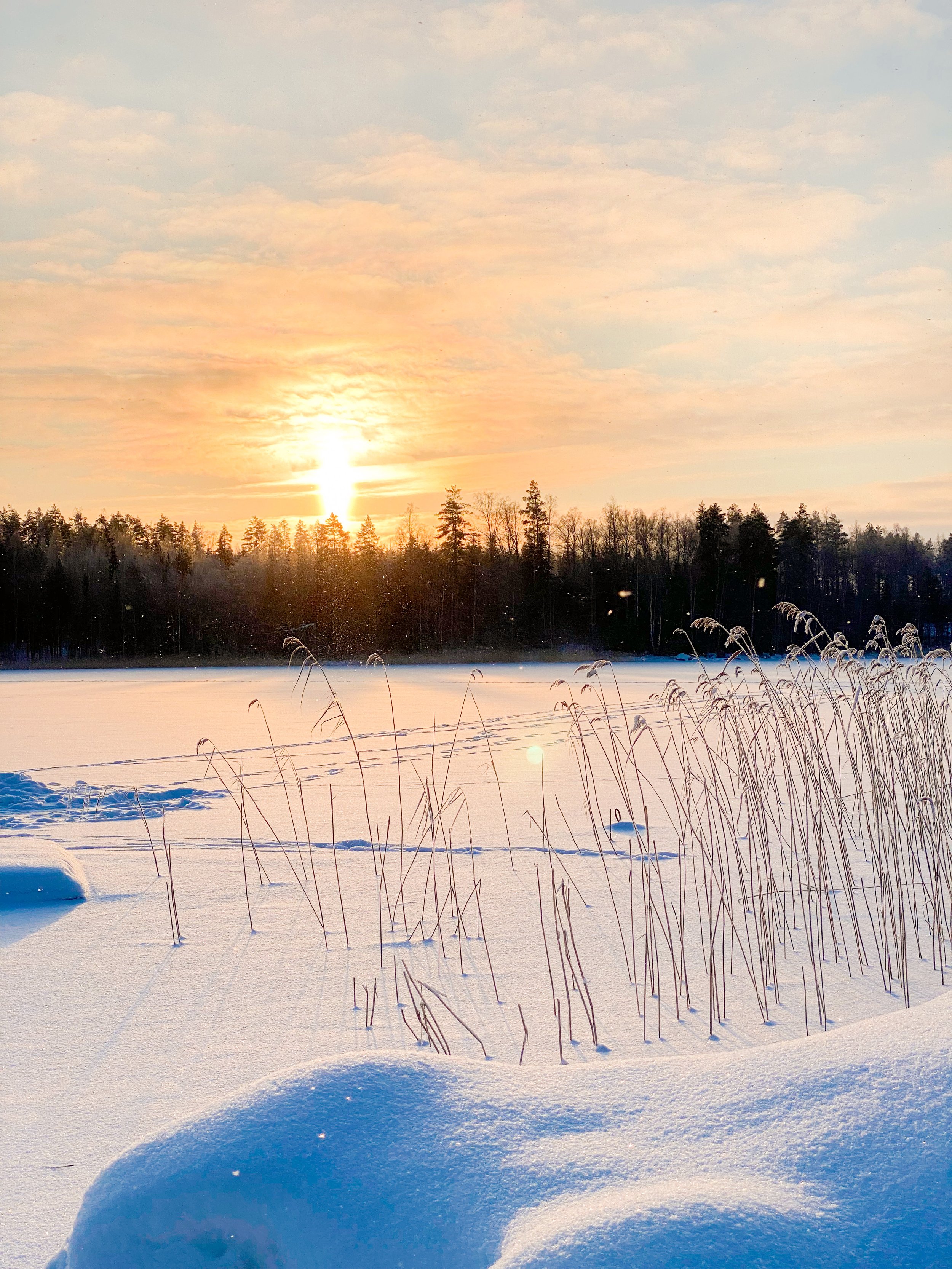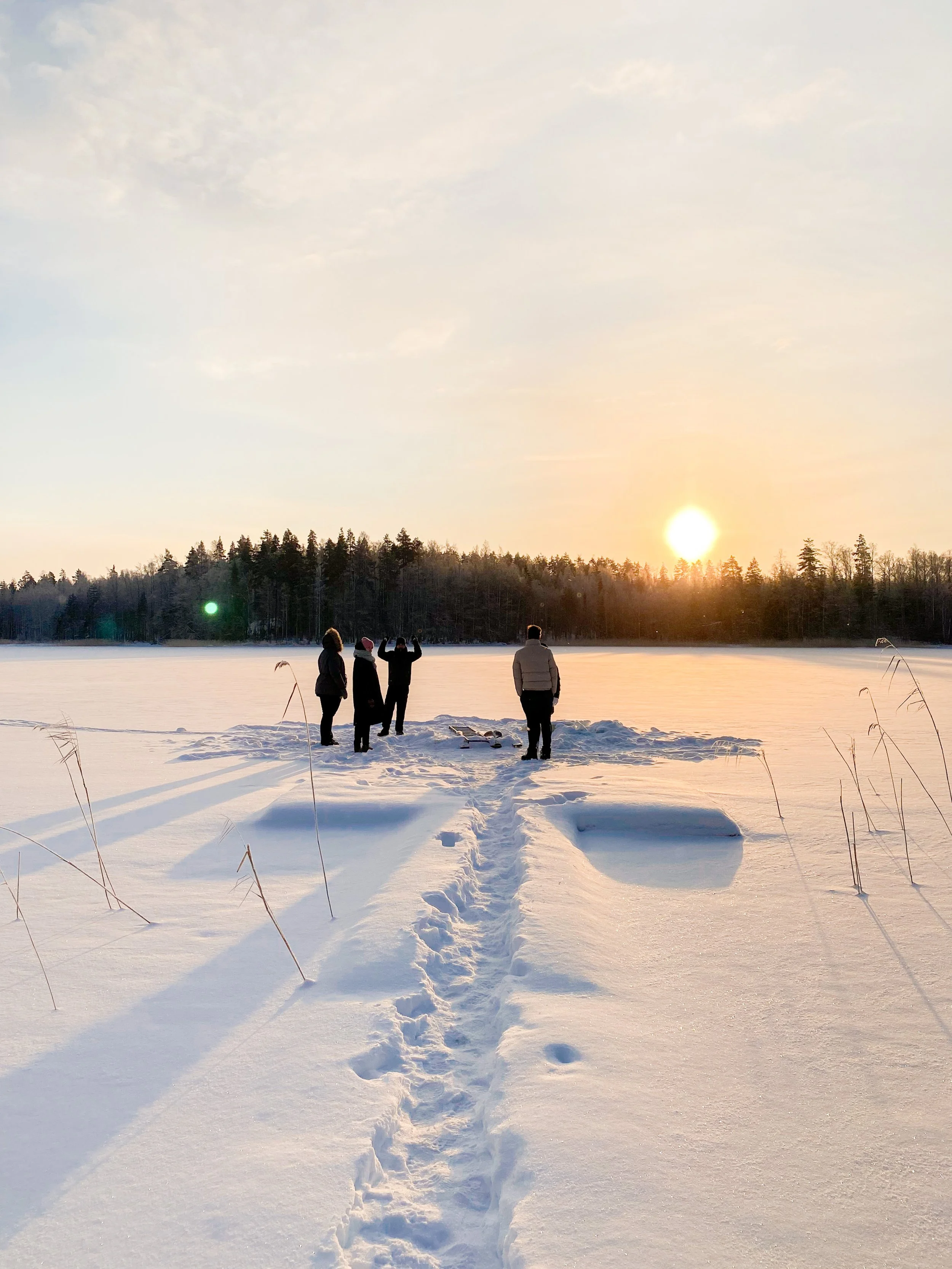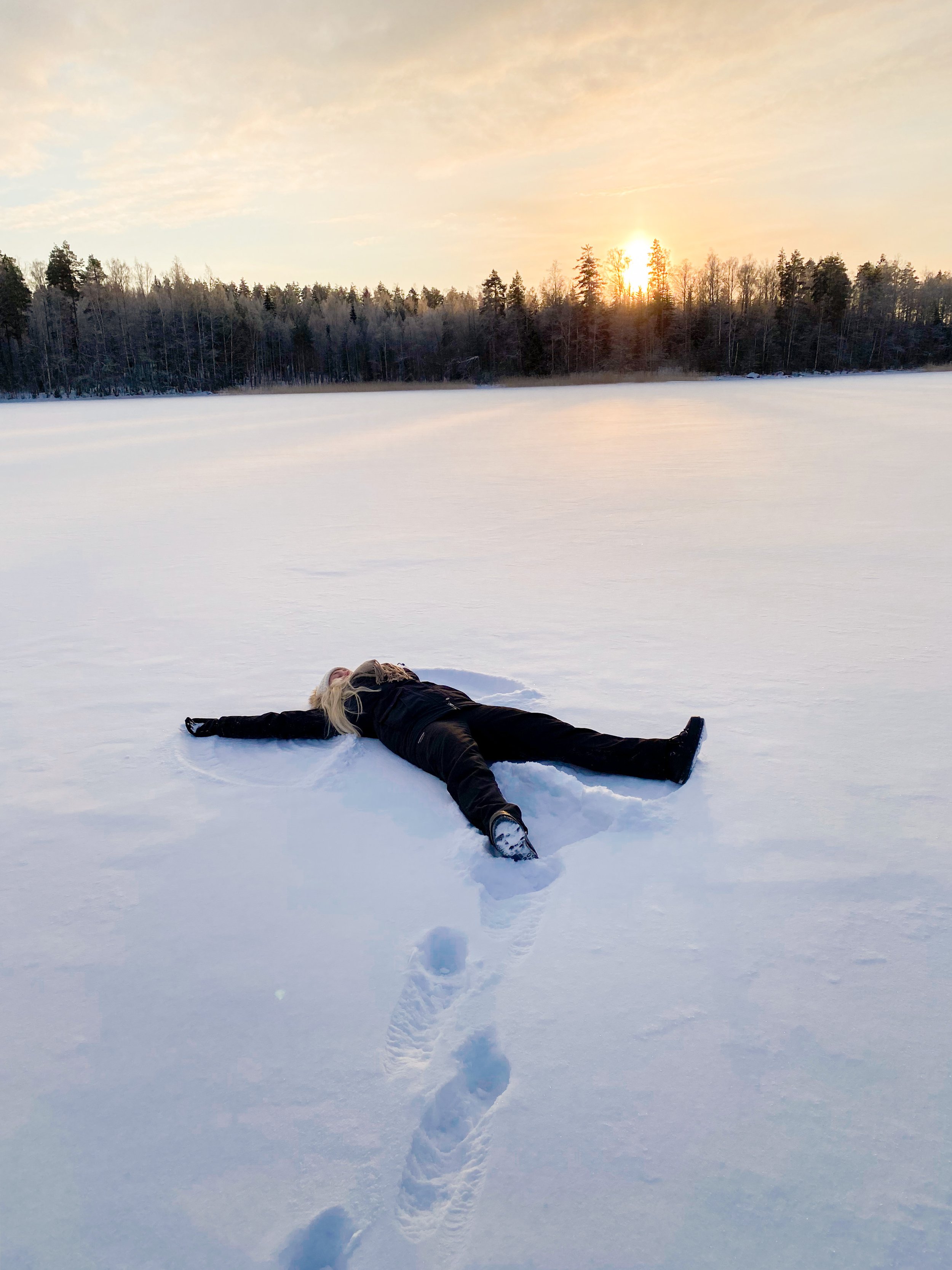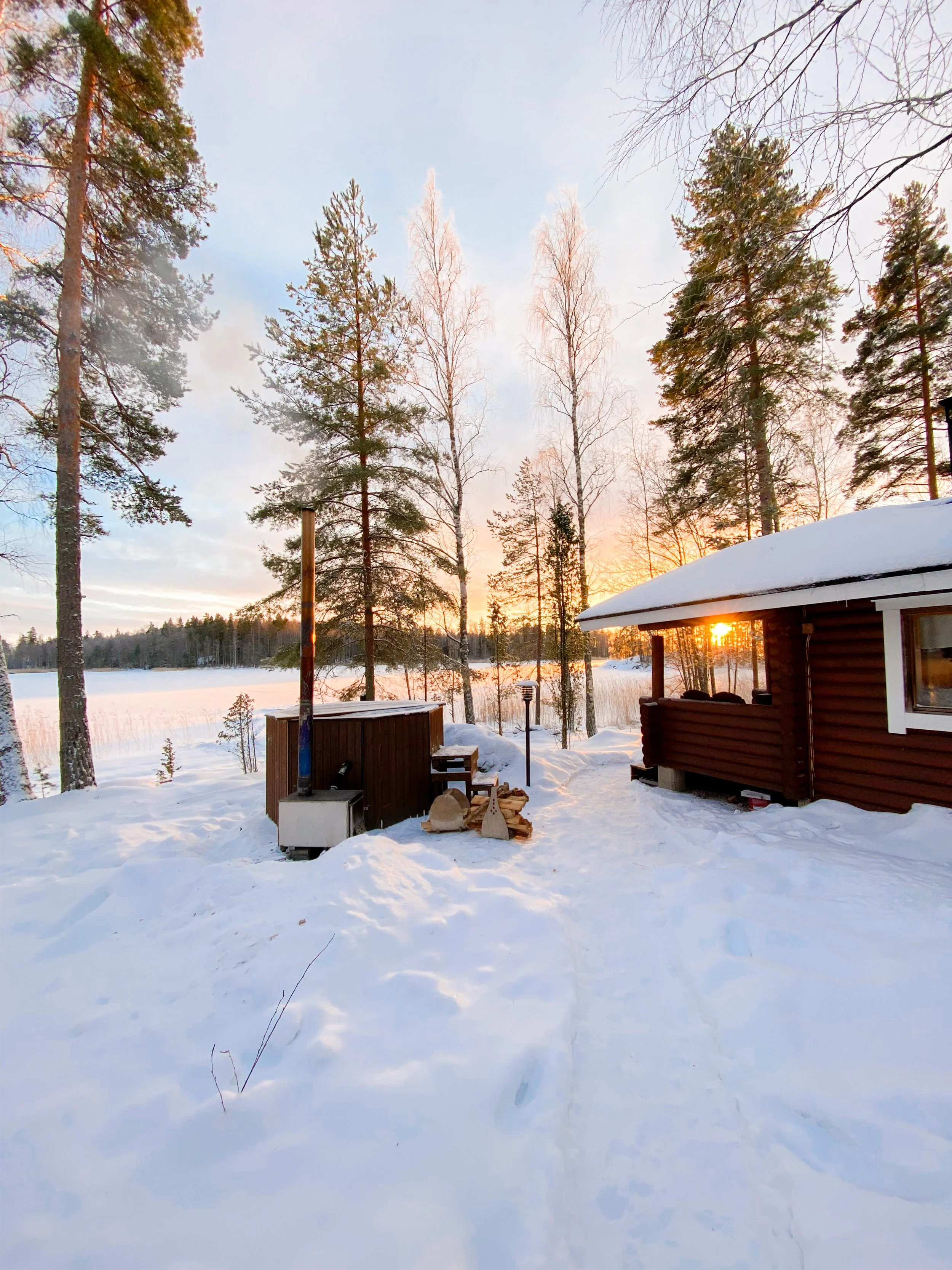 Aattona oli perhepäivä, käytiin miehen perheen luona aamupäivällä ja iltapäivällä osa miun perheestä tuli mökille meidän luokse syömään, saunomaan ja paljuilemaan. Tsempattiin myös toinen toisiamme avantoon, ja oon niin ylpeä itestäni että ekaa kertaa uskalsin mennä! En ollut siis aikasemmin ihan jäissä uinut ja etenkin tuolla mökillä kun puusaunasta käppäiltiin jäälle, missä laskeuduttiin tikkailla avantoon niin oli kyllä aivan super kokemus. Kävin joulun aikaan yhteensä neljä kertaa, ja jos tuollaisiin olosuhteisiin pääsee niin tänä talvena haluan vielä uudestaan. En usko että kykenen ainakaan vielä ihan ilman saunaa menemään. Muuten aika aattoiltana meni höpötellen, pelaten ja syöden! Seuraavana päivänä meille tuli ystäviä vieraaksi, nuorempana kokoonnuttiin tuolla porukalla Tapsan tansseihin mutta nyt saatiin joulupäivä järjestettyä ja oli niin kiva nähdä kaikkia. Oli oikeestaan sama suunnitelma ohjelman puoleen kun aattonakin, palju, sauna, ruoka, pelit, rentoilua. Sain uusia avantokavereita mistä olin innoissani! Hyvin pitkästä aikaa tuli oltua niin sanotusti “viihteellä” ja se oli just niin rankkaa kuin muistinkin, haha. Olin jo puolilta öin aivan naatti, kahden aikaa heräsin katsomaan vielä muiden temmellystä ennen kun pyörähin taas petiin. Aamulla heräsin ekan kerran puoli 7 jo aivan pirteenä päivään, siinä sitten odottelin muutaman tunnin että muut vihdoin heräili. Käytiin siinä päivällä kävelemässä jäällä ettei ihan mee vaan löhöömiseks sisällä kun ulkona oli taas niin kaunista.