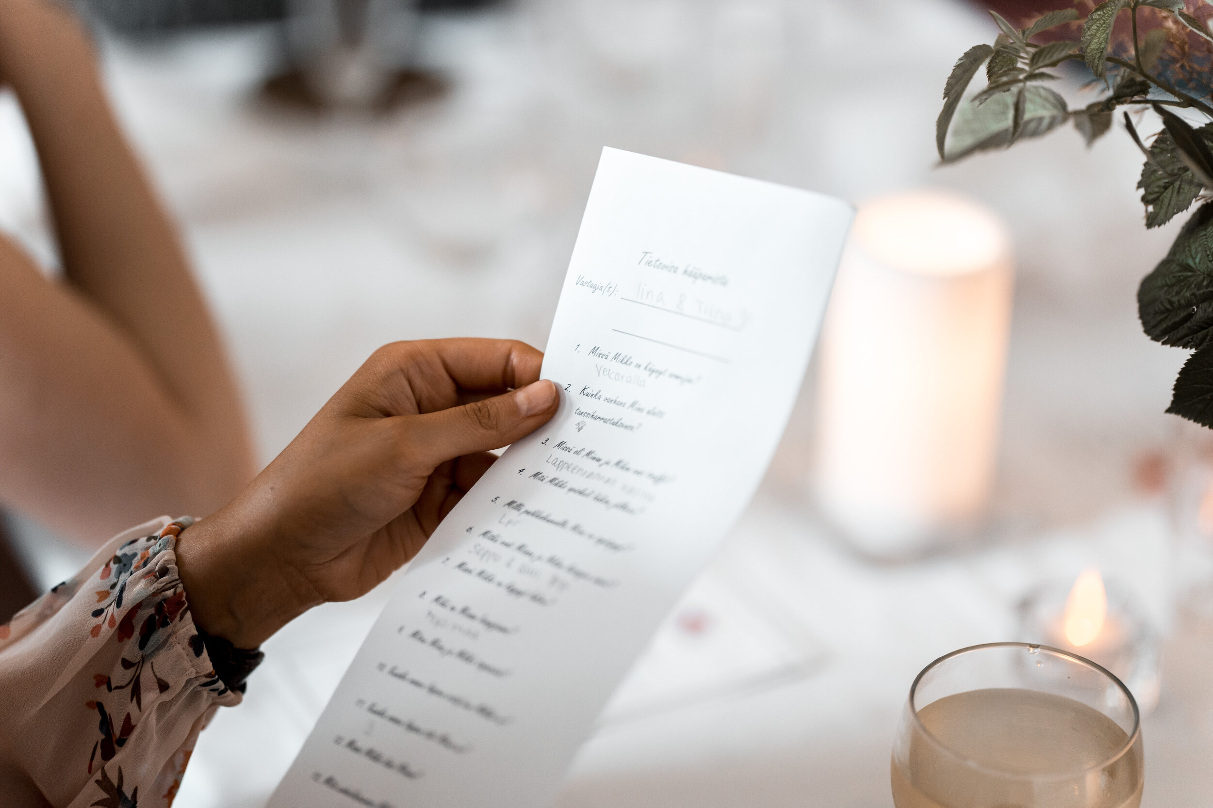 Juhlapaikkana meillä oli vanha vpk talo, koristelut olivat melko maltilliset; kynttilöitä, kukkia, led-valonauhoja ja lehtiköynnöksiä katossa, kultaisia yksityiskohtia kattauksessa ja meidän pöytäpaikan koristeluissa. Juhla oli aivan ihana ja meidän näköinen, vietettiin tiiviisti aikaa läheisten kanssa nauraen, itkien ja tanssien aamuyöhön asti. Heitin kimpun ja Mikko sukkanauhan, leikattiin kakku (voitin polkasun tietenkin), miun rakkaat tanssiystävät yllättivät esityksellä, häätiimi piti puheita, tarjoilut maistui kaikille, vieraat visailivat ja illan pitsapuffa hävisi ennätysajassa! Kaiken kaikkiaan 20.7.2019 oli yksi täydellisimmistä päivistä mitä varmasti tuun koskaan elämään.